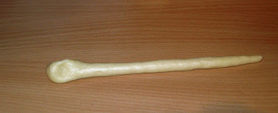 Jedes Stück zu einer Schlange rollen, dabei ein Ende spitz zulaufen lassen und das andere Ende wie eine Kugel formen.